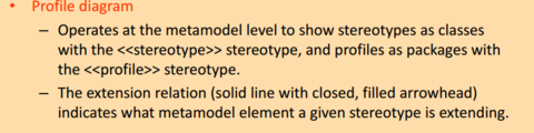 | - Beroperasi di peringkat metamodel untuk menunjukkan stereotaip sebagai kelas dengan stereotaip << >> stereotaip, dan profil pakej dengan yang << >> profil stereotaip. -Hubungan lanjutan (garis penuh dengan tertutup, mata panah diisi) menunjukkan apa unsur metamodel stereotaip yang diberikan adalah memperluas. | |
