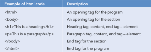 HTML is a language which relies on a series of tags. Tags usually operate in pairs. There is an opening tag such as <body>, <bp> or <p>, and an end tag. End tags are identified by starting with the ‘/’ character. For example: </body> closes the section of program called ‘body’; </bp> closes the bullet point tag and </p> ends the paragraph ‘p’. Tags which don’t operate in pairs include <img> (used to tag an image) and header tags (e.g. <h1>). The content between each pair of tags is called an HTML element. The language is written as a series of elements. Gradually the elements build up to describe a web page.