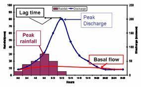 A graph that shows the discharge of a river following a storm event.