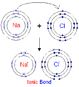| Show reaction between chlorine and sodium using electron diagrams | When an atom of chlorine reacts it will gain one electron from sodium. The outer shell of chlorine will then have 8 electrons and be full. The chloride ion will have an extra electron and therefore an extra negative charge (shown as a - sign). |