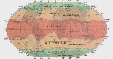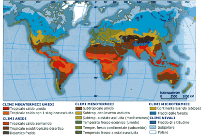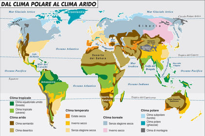 | Rispetto alla posizione geografica che una determinata regione ha rispetto all'Equatore, il clima può variare. La cartina mostra i diversi tipi di clima che interessano il nostro pianeta. | |