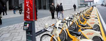La bici, specialmente per circolare in città, è un'ottima alternativa all'uso dell'automobile privata. Nella foto, il servizio di bici sharing in funzione a Milano (purtroppo le piste ciclabili non sono ancora numerose come accade nelle principali città europee). |