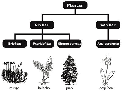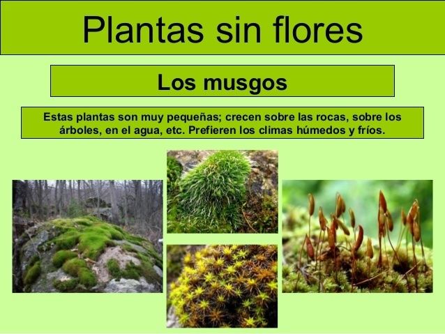 | ¿Cómo se le llama a las plantas sin flores? | las briofitas, como los musgos, y las pteridofitas, como los helechos. |