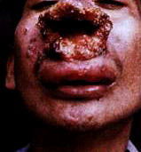 LEISHMANIOSE: Qual a manifestação mais comumente observada na LTA mucocutânea? | Infecção na derme com úlceras, lesão metastática com invasão da mucosa e destruição da cartilagem. |
