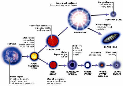 | History of star: End of star (Sun size or smaller) | When star runs out of hydrogen nuclei to fuse together, it reaches the end of its main sequence and swells out. Stars about the same size as the Sun or smaller swell out, cool down and turn red. Star is now a red giant at this stage helium and other light elements in its core fuse to form heavier elements. When there's no more light elements in its core, fusion stops and no more radiation is released, due to it's own gravity, the star collapses in one itself. As it collapses it heats up and turns from red to yellow to white. It becomes a white dwarf, this is a hot, dense white star much smaller in diameter than previously. Stars like the Sun then fade out, go cold and become black dwarfs. |