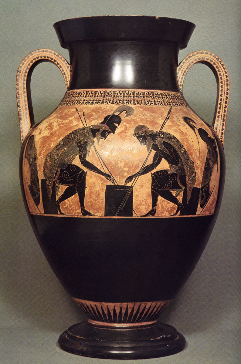 Name, Painter, Vase type, Date, Group? | Achilles and Ajax playing dice, Exekias, Belly Amphora, 540-530 BC, 6th Century Black Figure |
