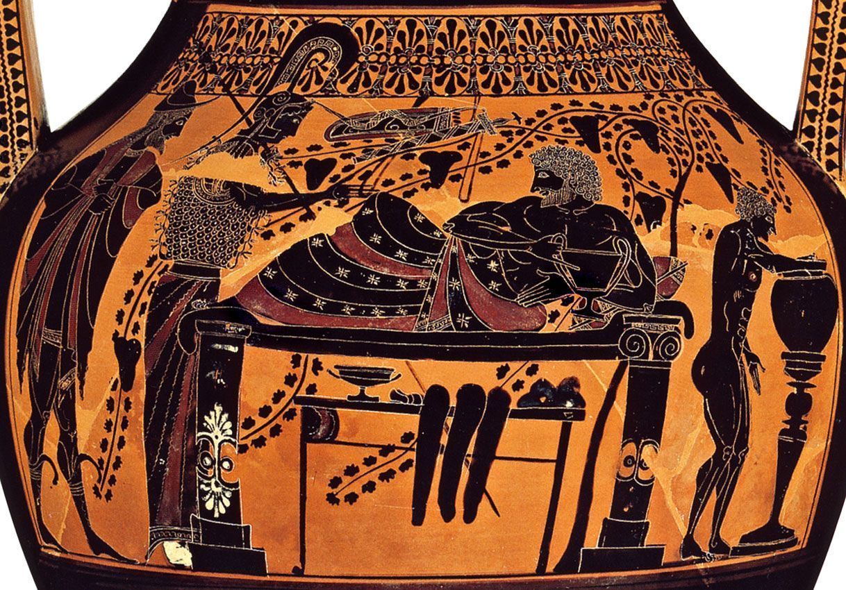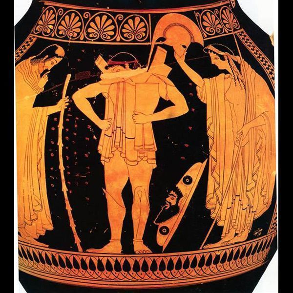 Name, Painter, Vase type, Date, Group? | Hector arming, Euthymides, Belly Amphora, 510 BC, Pioneer Group |