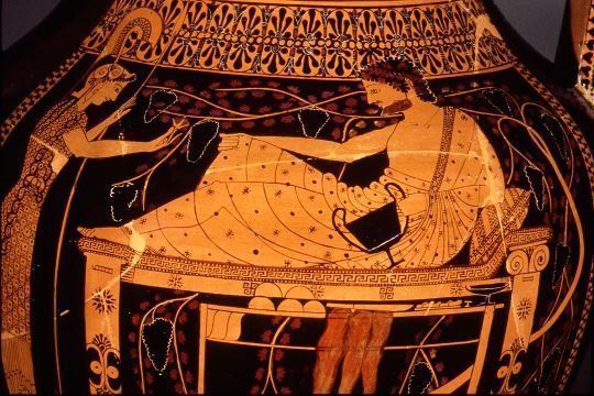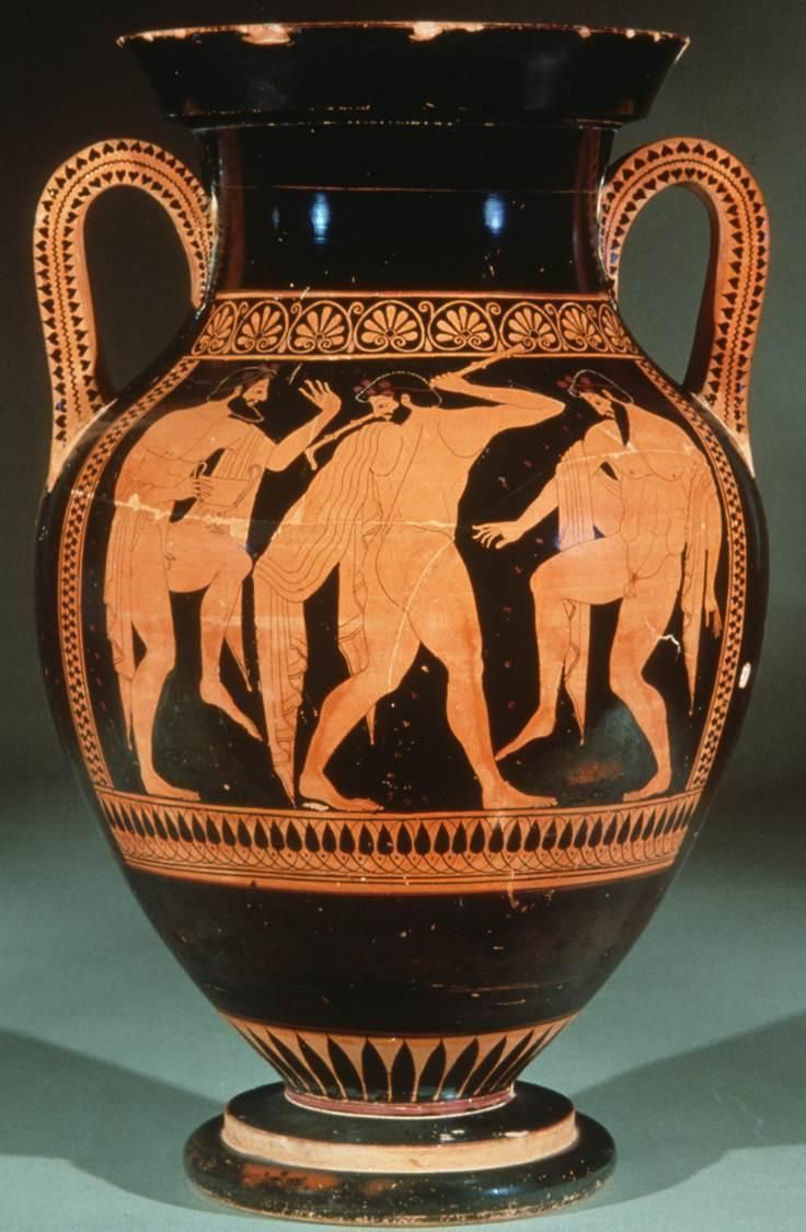 Name, Painter, Vase type, Date, Group? | Three men carousing, Euthymides, Belly Amphora, 510 BC, Pioneer Group |