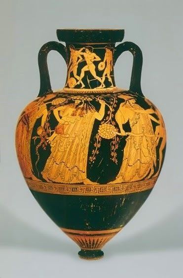 Name, Painter, Vase type, Date, Group? | Dionysus and the Maenads, Kleophrades, Pointed Amphora, 500-490 BC, 5th Century Red Figure |