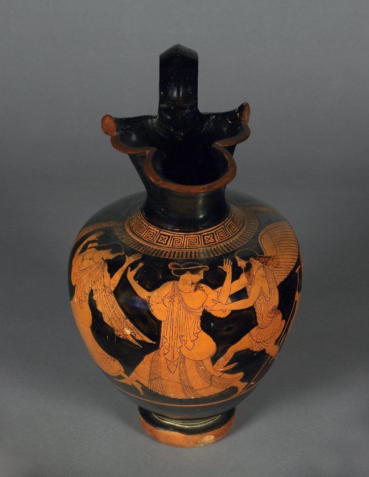 Name, Painter, Vase type, Date, Group? | Boreas pursuing Oreithyia, Pan Painter, Oinochoe, 480-460 BC, Mannerist/5th Century Red Figure |
