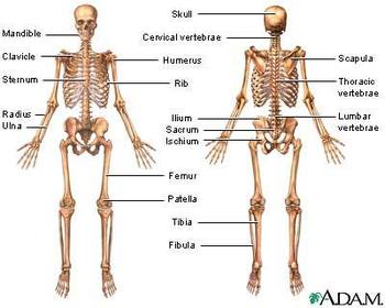 | Functions of the skeletal system: 1.Protection - the cranium and ribs protect the brain and vital organs in the chest. 2.Shape - gives shape to the body and makes you tall or short. 3.Support - holds your vital organs in place when playing sport. The vertebral column holds the body upright. 4.Movement - muscle are attached to bones, which are jointed. When the muscles contract the bones move. 5.Blood production - red blood cells (to carry oxygen) and white blood cells (to protect against infection) are produced in the bone marrow of some bones. | |