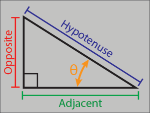 | Trigonometry is about right-angled triangles (90°). There are names for each side of the triangle: The hypotenuse, opposite and adjacent. the angle between the hypotenuse and adjacent is called theta. | |