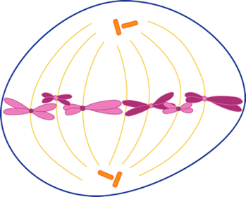 | what happens in metaphase? | The chromosomes line up along the middle of the cell, joined to the spindle fibres by their centromeres. |