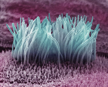 | What type of microscope would produce this image? | An SEM image of cilia cells in a human lung. |