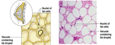| Adipose | Function: Energy storage, insulation, cushioning, contains lipids (fats) Location: deep in skin, buttocks, breasts |