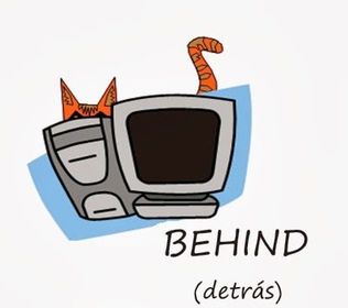 | The cat is behind the computer. | |