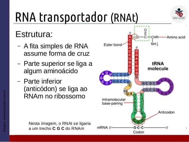 | RNAt | sua função é transportar as moléculas de aminoácidos que serão utilizados na síntese de proteínas. |
