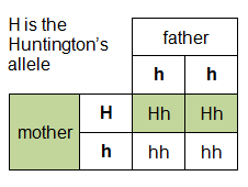 | Describe what's going on on this example of a Punnett Square: | In this example one parent carries one copy of the Huntington’s allele and has the disorder. The father does not carry the Huntington’s allele, so he does not have the disorder. There is a 1 in 2 or 50 per cent chance of the couple producing a child with the disorder. |
