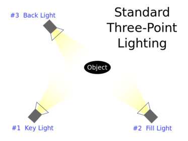 | Three-point lighting | Three separate light positions allowing photographer to illuminate subject however desired, while controlling the shading and shadows produced by direct lighting. |