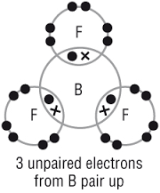 | Describe covalent bonds that disobey octet rule. | 1. Not reaching the octet Be and B (in period 2) do not have enough unpaired electrons to form a noble gas configuration in a compound. e.g Boron trifluoride, BF3. B has each of its 3 unpaired electrons paired in a covalent bond, while all three fluorine atoms reach an octet. 6 electrons in B outer shell. |