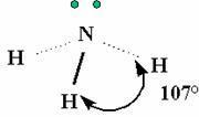 | Explain the shapes of, and bond angles in, molecules and ions with up to 6 electron pairs | Lone pairs repel more than bond angles as they have a slightly higher electron density, and therefore decrease the bond angles of the molecule by 2.5 degrees per lone pair. Therefore, as a molecule with four bonding pairs (tetrahedral) has bond angles of 109.5 degrees, the bond angles of a molecule with 3 bonding pairs and one lone pair will be 2.5 degrees less than that, at 107 degrees. This type of molecule is pyramidal in shape. |