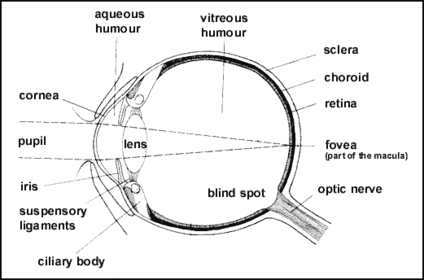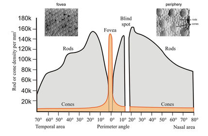 | A.1.3 State that the retina contains the rods and cones, and describe the variation in density across the surface of the retina. | Rods - not sensitive to colour; light sensitive. Not present in fovea Cones - Provide colour sensitivity; concentrated in fovea |