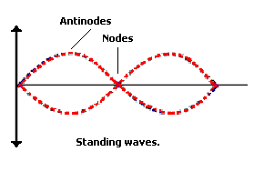| A.2.2 Explain the formation of one-dimensional standing waves. | Standing waves are the result of the interference of 2 waves of EQUAL AMPLITUDE and FREQUENCY in OPPOSITE DIRECTIONS. Nodes - Destructive Interference Antinodes - Max Constructive Interference |