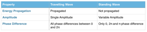 | A.2.1 Describe the nature of standing (stationary) waves. | 1.) No net propagation of energy. A standing wave does NOT move forward. 2.) Variable Amplitudes. 3.) All particles in a standing wave will either be in phase, π, or out of phase w/ each other |