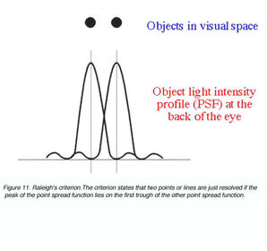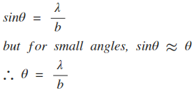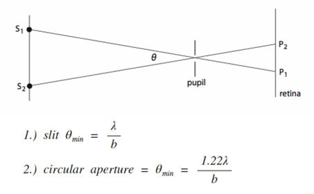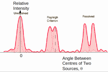 | A.5.2 State the Rayleigh criterion for images of two sources to be just resolved. | - Just resolved: CMOFM (Central Max Overlaps First Min) - Criterion for aperture is θ = 1.22λ/b |