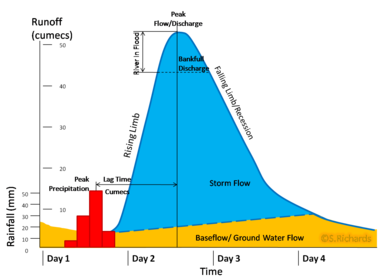 | Lag time and chances of flooding | a short lag time will cause the river discharge to rise steeply. The steeper the rise in discharge, the greater the chances of flooding. on the contrary, a lengthy lag time means lower discharge and less chances of flooding |