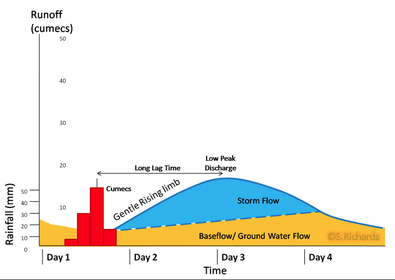 | Factors affecting the gentle shape of a flood hydrograph (WW p281 fig 17.7) | RELIEF - slower runoff on more gentle slopes ROCK TYPE - throughflow and groundwater flow as rainfall infiltrates into permeable (porous) rock NATURAL VEGETATION - forest; most interception. Roots delay throughflow and absorb moisture. Evapotranspiration reduces chances of water reaching river |