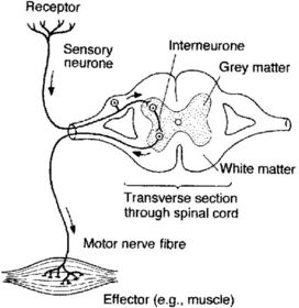 Describe a simple reflex action | ■ impulses from a receptor pass along a sensory neurone to the CNS ■ chemicals released at synapse between sensory and relay neuron diffuse across gap ■ chemicals released at the synapse between a relay neurone and motor neurone , impulse goes to effector that brings about the response |