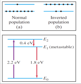 | G.1.9 Outline the mechanism for the production of laser light (population inversion). | (1) LASER (Light Amplified by Stimulated Emission of Radiation)'s power source is to provide energy that excites the atoms in the light-amplifying substance to become excited. (2) Absorbs non-coherent radiation from a power source. Photons emitted from the electrons in the metastable all in phase (3) Atoms are excited to higher states w/ high voltage, drop down to lower energy state, then intermediate metastable in which electrons get 'stuck'. (4) Eventually, more electrons found in metastable state than ground state. Stay longer in the m.stable e.level. "Lasing" begins. |