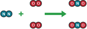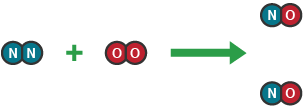 | Nitrogen oxides When fuels are burned in vehicle engines, high temperatures are reached. At these high temperatures, nitrogen and oxygen from the air combine to produce nitrogen monoxide. One nitrogen molecule (N2) reacts with one oxygen molecule (O2) to make two nitrogen monoxide molecules (NO). nitrogen + oxygen → nitrogen monoxide N2(g) + O2(g) → 2NO(g) | - |