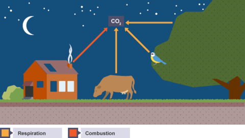 | Carbon enters the atmosphere as carbon dioxide from respiration and combustion. | |