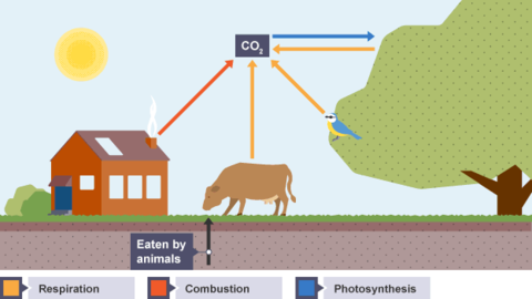 | Animals feed on the plant passing the carbon compounds along the food chain. Most of the carbon they consume is exhaled as carbon dioxide (formed during respiration). The animals and plants eventually die. | |