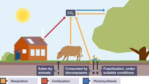 | The carbon cycle Most of the chemicals that make up living tissue contain carbon. When organisms die, the carbon is recycled so that it can be used by other organisms. The model that describes the processes involved is called the carbon cycle. | - |