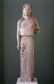 | 3 locks on each side, Archaic smile, Residual paint buried to hide from persians, women were always clothes archaic statuary, votive statue of a goddess once held identifying attribute in missing left hand. | Peplos Kore, From the Acropolis, Athens, Greece, ca. 530 BCE, Archaic |