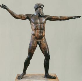 | Pg. 123 - In this Early Classical statue of Zeus hurling a thunderbolt, both arms are boldly extended and the right heel is raised off the ground, underscoring the lightness and stability of hollow-cast bronze statues. | Zeus (or Poseidon?), from the sea off cape Artemision, Greece, ca. 460-450. Bronze, Early High Classical |