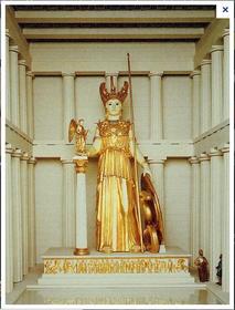 | Pg. 128- Inside the cela of the parthenon was Phidias's 38ft tall, gold and ivory, fully armed holding nike (victory) in extended right hand. soles of her sandals -centauromachy exterior of her shield-amazonomachy shield interiro-Gigantomachy | Phidias, Athena Parthenos, in Cella of the Parthenon, Acropolis, Athens, Greece, ca. 438 BCE, Classical |