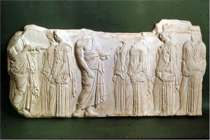 | Elders and maidens of the east frieze? | Details of the panathenaic festival procession frieze?, from the pathenon, Acropolis, Athens Greece ca. 447 BCE, Early & High classical |