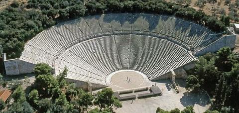 | The Greeks always situated their theaters on hillsides, which supported the cavea of stone seats overlooking the circular orchestra. THe epidauros theater is the finest in greece. seated 12,000 spectators | Polykleitos the Younger, Theatre, Epidauros, Greece, ca. 350 BCE, High Classical |