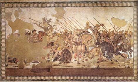 | Captured the psychological intensity of the confrontation between the two kings. Greeks employed foreshortening to model figures in color and to depic reflections and shadows. | Philoxenos of Eretria, Battle of Issus, ca. 310 BCE. Roman copy from the house of Faun, Pompeii, Italy, late 2nd or 1st BCE, Greek Hellenistic |