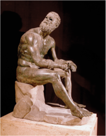 | Pg. 151- Trickles of blood on his face, bronze, battered face, we've left stylization for realism | Seated Boxer, from Rome, Italy, ca. 100 BCE. Hellenistic |