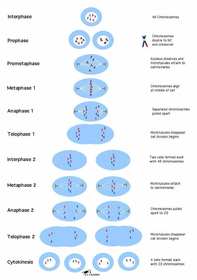 | (a) describe, with the aid of diagrams and photographs, the behaviour of chromosomes during meiosis, and the associated behaviour of the nuclear envelope, cell membrane and centrioles. (Names of the main stages are expected, but not the subdivisions of prophase); | |