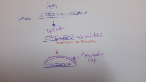 | atheroma pathogenesis | 1-endothelial injury in intima 2-lipid enter to sub endothelial 3- oxidation of lipid by macrophages 4-migration of smooth muscle from media to intima and form fibro muscular cap |