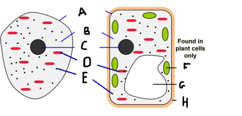 | A-Cell Membrane B-Cytoplasm C-Nucleus D-Mitochondria E-Ribosome F-Chloroplast G-Vacuole H-Cell Wall | |