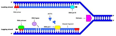 7.2.2 Explain the role of Helicase, RNA primase and DNA polymerase III in DNA replication. | Helicase unwinds and separates the double stranded DNA by breaking the hydrogen bonds between base pairs This occurs at specific regions (replication origins), creating a replication fork of two polynucleotide strands in antiparallel directions RNA primase synthesises a short RNA primer on each template strand to provide an attachment and initiation point for DNA polymerase III DNA polymerase III adds deoxynucleoside triphosphates (dNTPs) to the 3' end of the polynucleotide chain, synthesising in a 5' - 3' direction The dNTPs pair up opposite their complementary base partner (adenine pairs with thymine ; guanine pairs with cytosine) As the dNTPs join with the DNA chain, two phosphates are broken off, releasing the energy needed to form a phosphodiester bond Synthesis is continuous on the strand moving towards the replication fork (leading strand) Synthesis is discontinuous on the strand moving away from the replication fork (lagging strand) leading to the formation of Okazaki fragments |