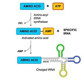 7.4.1 Explain that each tRNA molecule is recognised by a tRNA-activating enzyme that binds a specific amino acid to the tRNA using ATP for energy | Each different tRNA molecule has a unique shape and chemical composition that is recognised by a specific tRNA-activating enzyme The enzyme (aminoacyl-tRNA synthetase) first binds the amino acid to a molecule of ATP (to form an amino acid-AMP complex linked by a high energy bond) The amino acid is then transferred to the 3'-end of the appropriate tRNA, attaching to a terminal CCA sequence on the acceptor stem and releasing the AMP molecule The tRNA molecule with an amino acid attached is thus said to be 'charged' and is now capable of participating in translation The energy in the bond linking the tRNA molecule to the amino acid will be used in translation to form a peptide bond between adjacent amino acids |