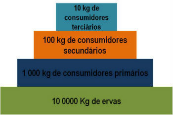 Uma comunidade com quantidades de biomassa em cada nível trófico. A base contém maior quantidade de biomassa.